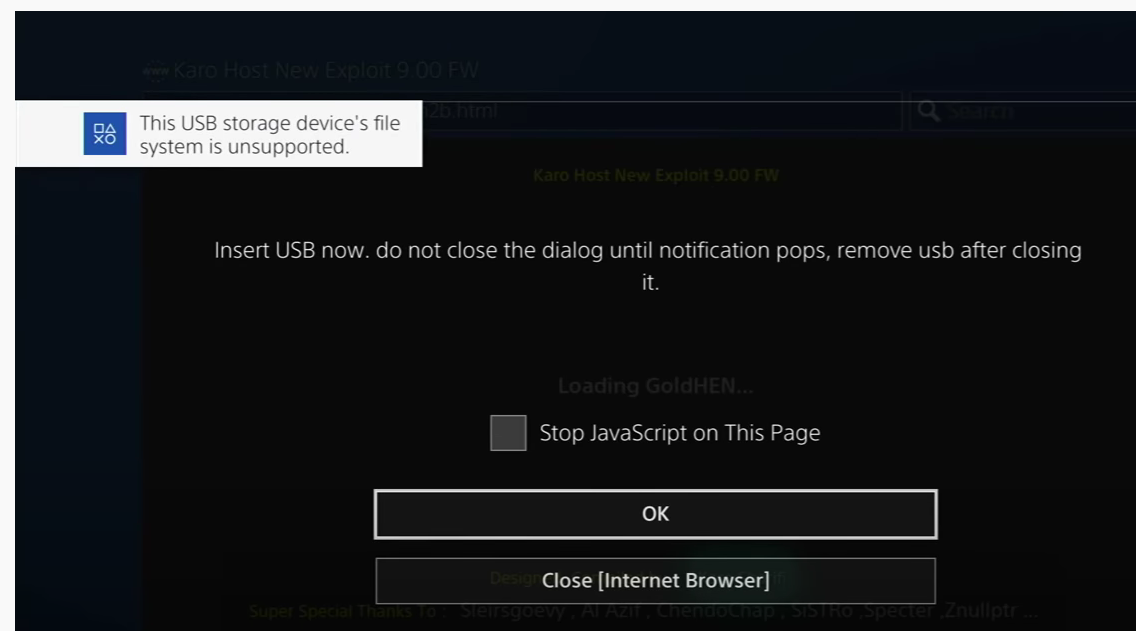 9. 아래 창이 뜨면 ③에서 만든 USB를 PS4본체에 꼽고, USB장비 미지원 팝업 창이 좌측 상단에 뜨면, OK버튼 누르기