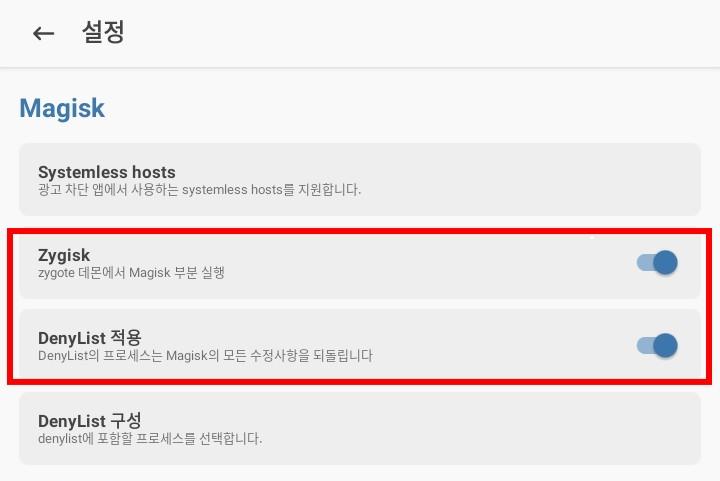 10. Zygisk 옵션을 켜주시고, DenyList 적용도 이후 같이 켜줍니다. 그리고 안드로이드 재부팅 해주세요.