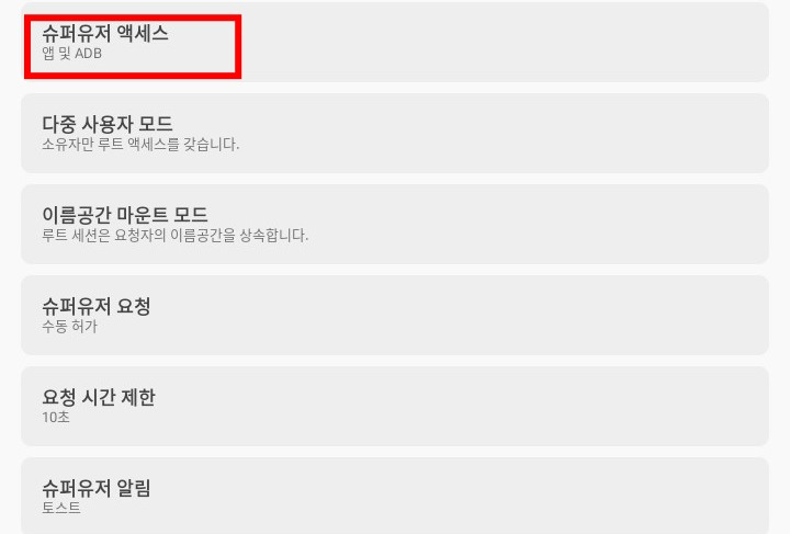 7. 잠시 안드로이드로 돌아갑시다. Magisk에서 adb에 su권한을 줘야 합니다.(주지 않으면 권한 없음 오류 발생) 설정에서 '슈퍼유저 액세스'를 '앱 및 ADB'로 변경해주세요