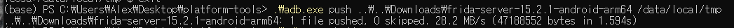 6. adb push 명령어를 통해 3에서 압축해제한 (frida-server-15.2.1-android-arm64)을 안드로이드 /data/local/tmp 로 복사합니다.