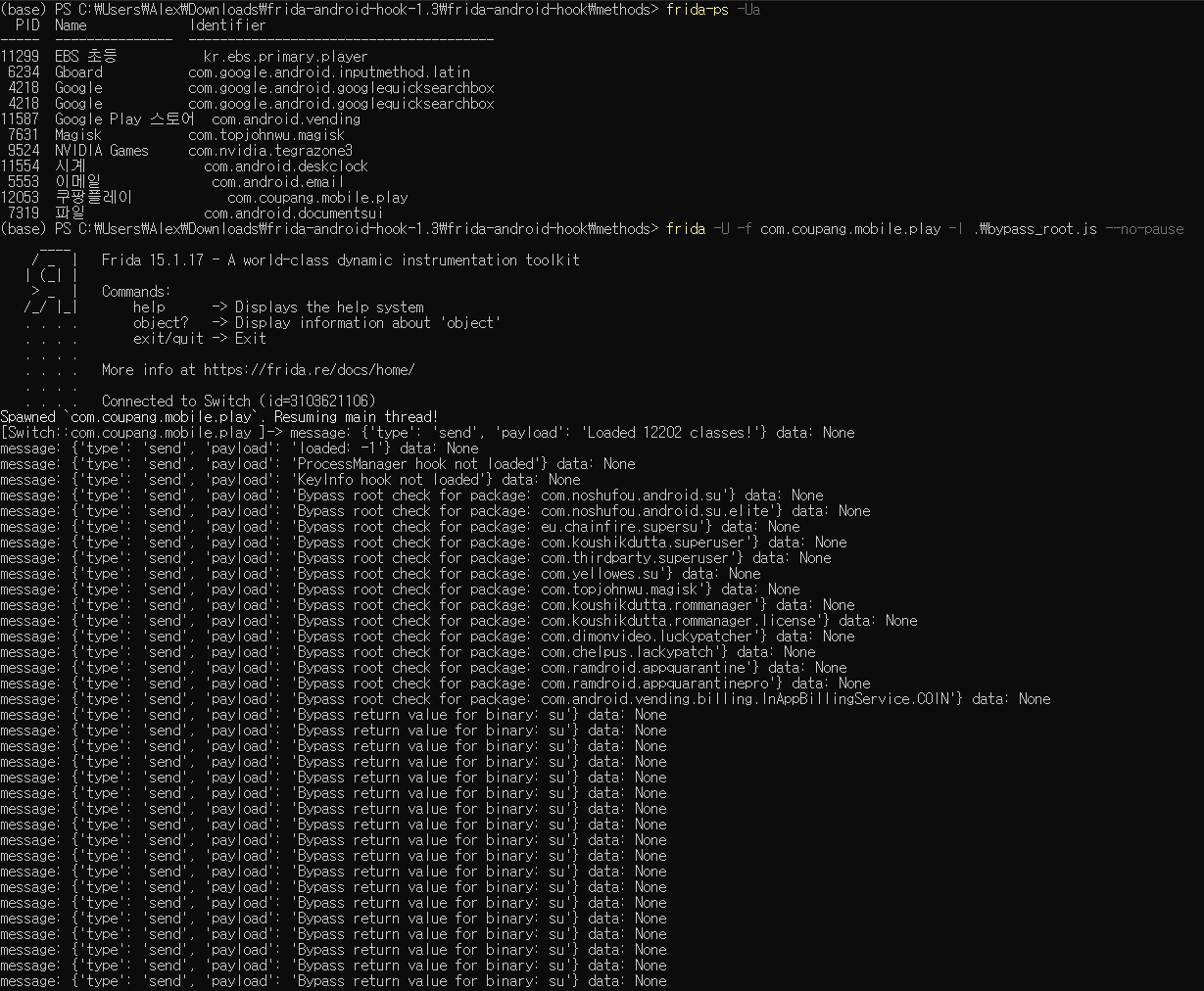 12. frida-ps -Ua 입력해서 설치된 앱 패키지의 이름과 패키지 ID 를 확인합니다. 그리고 명령어를 통해 실행시켜 주면 후킹 및 실행 완료!