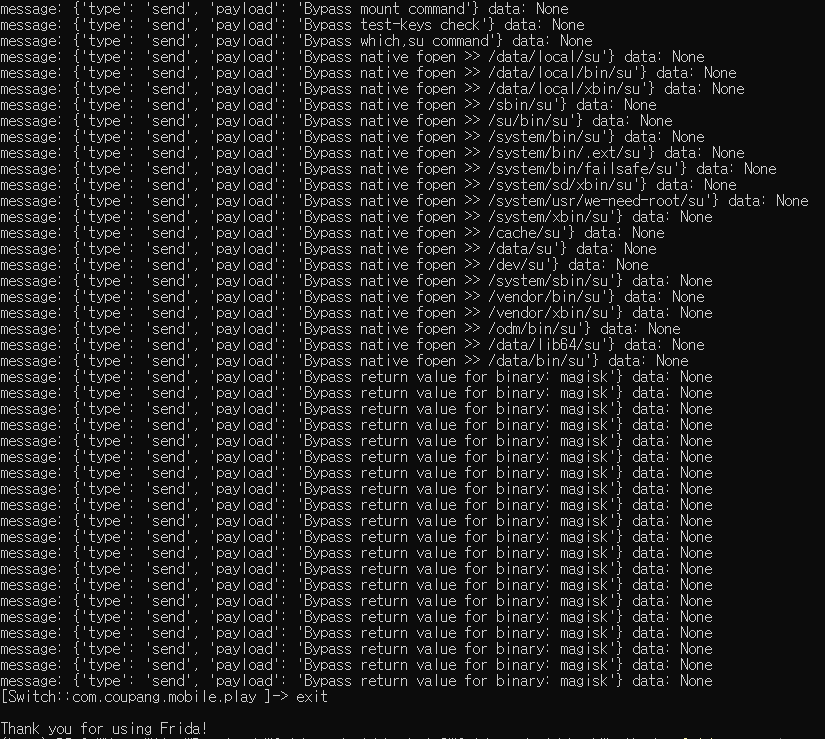 이 경우, 프리다(Frida)를 이용하면 쉽게 우회가 되었습니다.